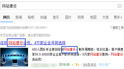 好比搜索“網(wǎng)站建設(shè)”時,創(chuàng)意的飄紅情況如下,其中與搜索詞一致或意義相近的部分均獲得了飄紅: